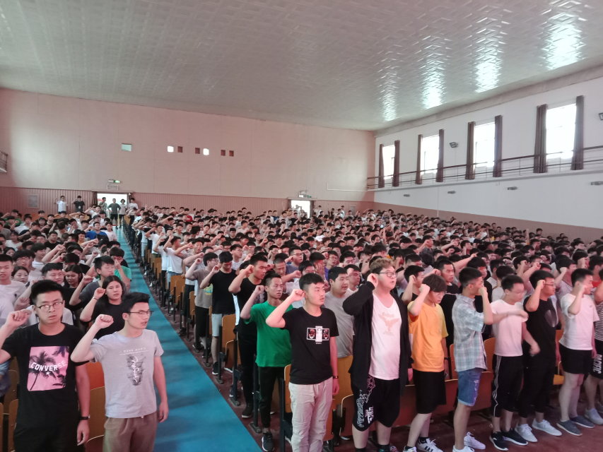 接着,由员工代表机电1808班李洋学带领全体员工进行诚信考试宣誓:自觉自律,保证考场纪律;自尊自爱,参与公平竞争;诚信考试,维护人格尊严;拒绝作弊,倡导优良考风。