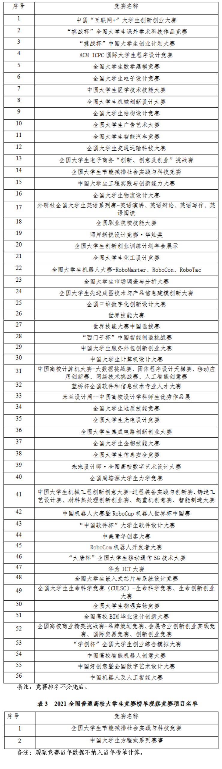 根据相关管理原则,基于竞赛数据采集、综合评价和专家委员会投票情况,确定1项赛事退出榜单,原56项竞赛继续纳入榜单(榜单内已有竞赛的子赛纳入但不计算项目数),2项赛事列入2022年重点观摩和考察项目。详见下表。
