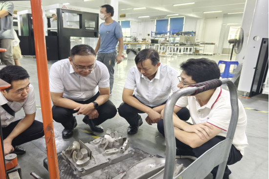 在东莞市磐锐科技有限公司董事长樊伟超的陪同下,黄振中一行首先重点参观了公司的生产车间与成果展览馆。参观过程中,黄振中董事长对金属 3D 打印技术表现出了浓厚的兴趣,与车间技术人员进行了深入的探讨,对车间内的 3D 打印机设备以及打印出的金属零件进行了细致入微的了解。