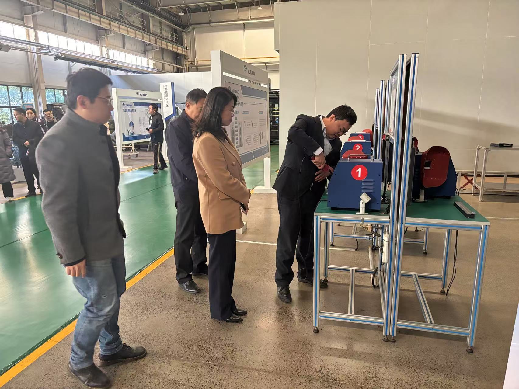 在宇通的新能源厂区,人力资源部经理宁卫广首先带领大家参观了试车场,不同类型的车辆依次在全地形场地进行高速测试,以确认车辆的可靠性与稳定性,党员们也学习了解了车辆出场的抽检率和测试要点;随后,宁卫广带领大家参观了组装车间,各种车辆正在有序搭建,宁卫广向滕文锐简要介绍了装配工艺的步骤和优势;最后,党员们一同参观了研发中心,各位老师结合自己的专业,分别对其中的理论培训室、焊接实训室、装配实训室、涂装实训室和技能大师工作室等场所进行了详细的观摩,特别是和技能大师牛东昌面对面进行了切磋交流,深入了解了宇通公司的发展理念、生产工艺、科技变革和匠心文化。