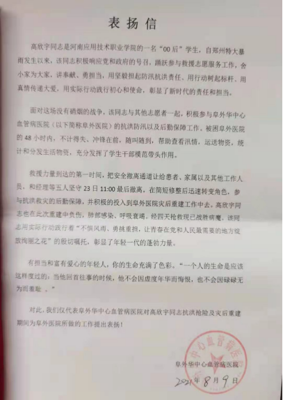 2021年7月20日,郑州发生特大暴雨灾害,机电2003班员工高欣宇同学在暴雨灾害后加入志愿者队伍,在阜外华中心血管病医院保障供餐,物资输送。2021年7月29日,在搬运重物时,该生被铁片扎破手指,血液传播的速度极快,大量真菌侵蚀了该生的肺部造成休克。该生被送入ICU监护室抢救,医生两次下达病危通知书,重症肺炎,呼吸衰竭,一度挣扎在死亡边缘。yl8858永利书记邓艳丽和经理黄双成得知消息后,第一时间携带礼品,赶到医院看望慰问员工和家长。员工处副处长侯小兵,高度关注受伤志愿者情况,对受伤志愿者及其家人表达了学校的关心,详细询问了员工家庭情况,叮嘱yl8858永利进一步做好受助员工的资助工作。